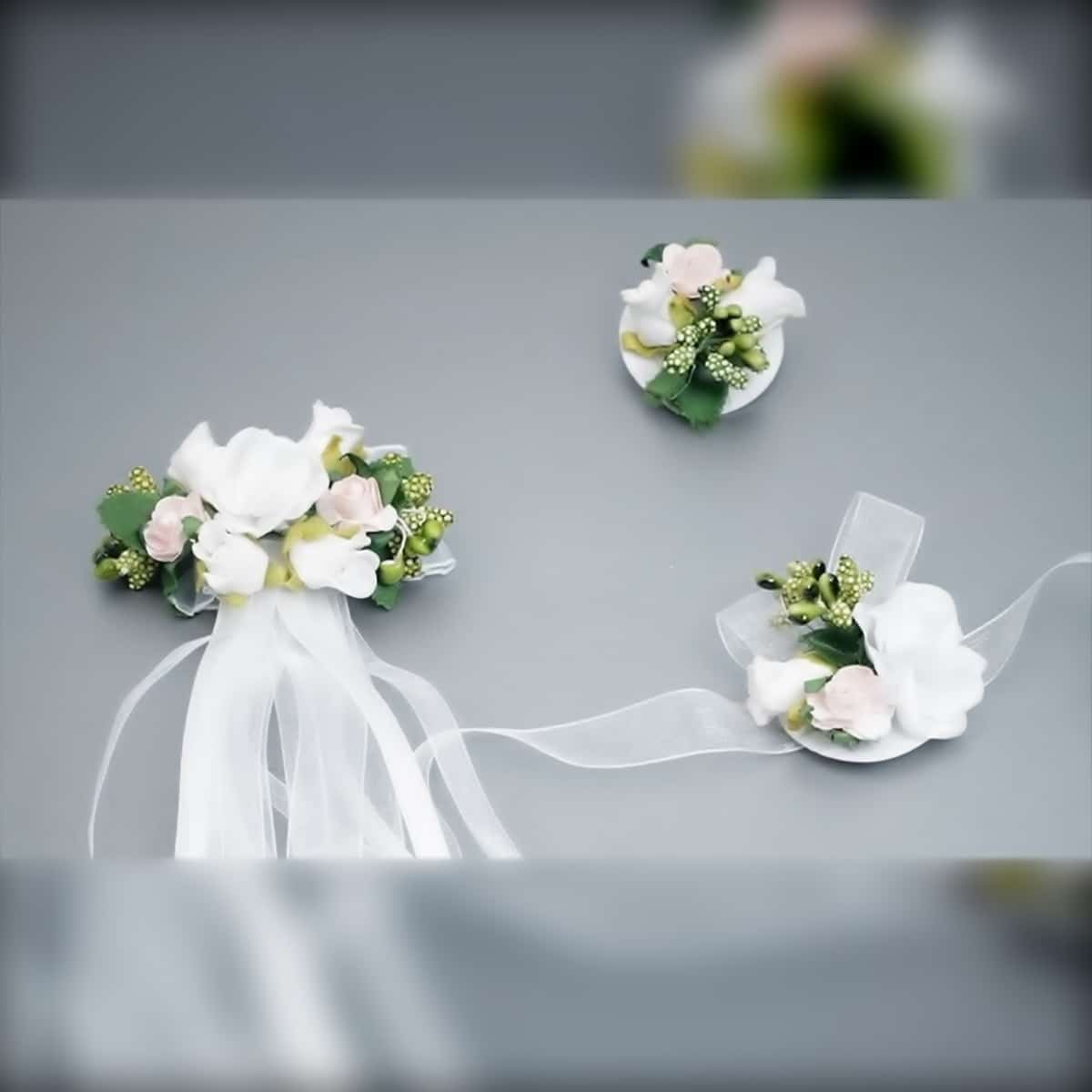 - Besteht aus: Haarkranz, Handschmuck, Kerzenschmuck und Dekor für die Handtasche