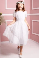 Erleben Sie mit dem Kommunionkleid Dalary DK-407 in strahlendem Weiß ein Kleid, das sowohl Eleganz als auch reine Lebensfreude ausstrahlt. Dieses wunderschöne Blumenmädchen-Kleid, perfekt für jeden besonderen Anlass, ist aus 100% hochwertigem Polyester gefertigt, während das Futter aus Acetat und Polyester für zusätzlichen Tragekomfort sorgt.